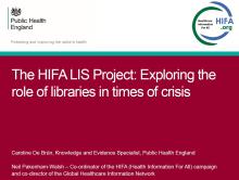 The HIFA Project on Library and Information Services (LIS) aims to leverage the individual and collective HIFA membership to support communication, understanding and advocacy for library and information services as they relate to global public health and evidence-informed decision making by health professionals, citizens, and policymakers. The project's focus includes global health, population health, disaster preparedness, emergencies, and disease outbreaks.